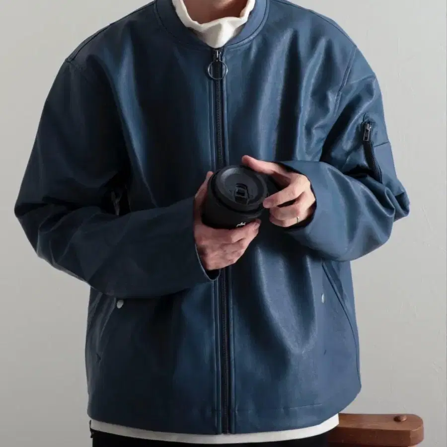 트렌디한 인조 가죽 소재를 채용한 플라이트 자켓형 블루종.