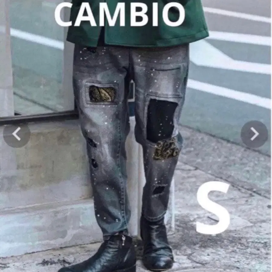 CAMBIO(캄비오) ] Distressed Soft Balloon Silhouette Denim Pants 데님 팬츠(S42725cmb) 상품번호 mp13110 12,980엔 (세금 포함) SIZE: S BLACK 175cm B90-W73-H89 신발 26.5cm의 모델이 M 사이즈를 착용. 유즈드 가공을 더한 벌룬 실루엣의 데님 팬츠입니다. 구제 의류를 리메이크한 듯한 헤리티지한 표정이 특징. 몸통 부분에는 블라스트, 쉐이빙 등의 워싱, 데미지 & 리페어, 페인트 스플래쉬 등의 유즈드 가공을 더했습니다. 에스닉풍 패턴의 고블랑 직물을 부분적으로 리페어하여 개성 있는 마무리를 하였습니다. 스트레치 데님을 사용하여 착용감의 편안함도 갖추고 있습니다. 밑위는 일반 팬츠보다 깊게, 허벅지부터 엉덩이 둘레는 넓게 설정하고, 밑단 입구를 살짝 조인 듯한 벌룬 스타일의 실루엣입니다. 인심 사이즈는 앵클 길이와 가까운 깔끔해 보이는 길이감으로 설정했습니다. 허리는 평고무와 스핀들을 사용한 이지 사양입니다.