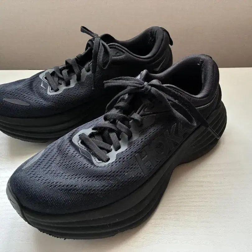 HOKA BONDI 8 / 호카 본다이 8 26.5cm 블랙 2년 전에 호카 직영점에서 새상품으로 구매했습니다. 착용 빈도는 주 1~2회 정도로 시내에서 신는 용도입니다. 전체적으로 눈에 띄는 얼룩이나 흠집은 보이지 않지만, 힐 입구 안쪽에 오른발은 원단이 찢어진 부분, 왼발은 원단이 얇아진 부분이 있습니다. 또한, 밑창은 노후화로 인해 얇아진 부분이 있습니다. 각각 이미지를 첨부했습니다. 노후화된 중고품임을 이해하시는 분만 구매해 주십시오. #러닝화 #조깅화 사이즈 - 26.5cm