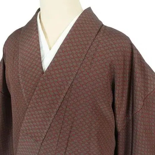 차분한 적동색 계열 (차분한 브라운 계열 색상) 기하학적인 망사 패턴의 이중 기모노입니다. 안감 등솔 실에 노란 얼룩이 나와 있지만 착용에는 지장이 없습니다. 이미지 6번째 참고. 겉감: 세련된 줄무늬 패턴 실크 100% 손바느질 처리 적정 신장 160cm 전후의 분께 적합 [ 치수 기장 (어깨부터) ] 기장 160.0cm 소매 길이 49.0cm 소매 폭 33.0cm 화장 63.0cm 앞 폭 24.5cm 뒷 폭 28.5cm 기장 12cm, 화장 9cm, 소매 길이 5cm 정도의 겉감 천이 접혀 있습니다.