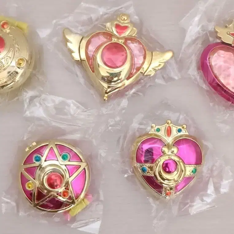 세일러문 테마의 캡슐 토이 5개 세트로, 골드와 핑크의 아름다운 디자인이 특징입니다.