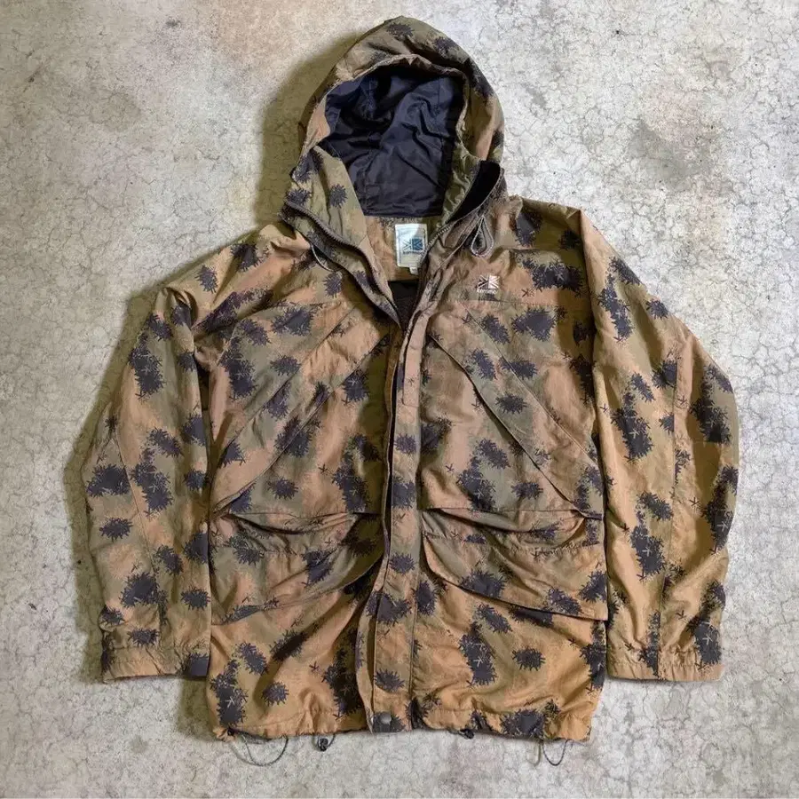 브랜드 로고가 빽빽하게 들어간 레어한 디자인입니다. 스트링이 달려 있어 기장을 짧게 조절할 수 있습니다. 새상품급입니다. #나일론자켓 #카모 #리얼트리 사이즈 - M