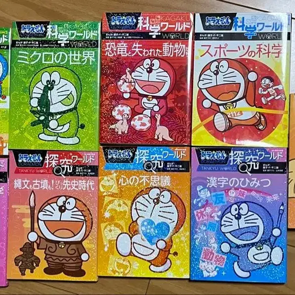 다양한 테마를 다룬 도라에몽 아동서 전 10권 세트. - 시리즈명: 도라에몽 탐구 월드 - 권수: 전 9권 - 테마: 정치, 과학, 동물, 역사 등 - 출판사: 소학관 - 대상 연령: 어린이용