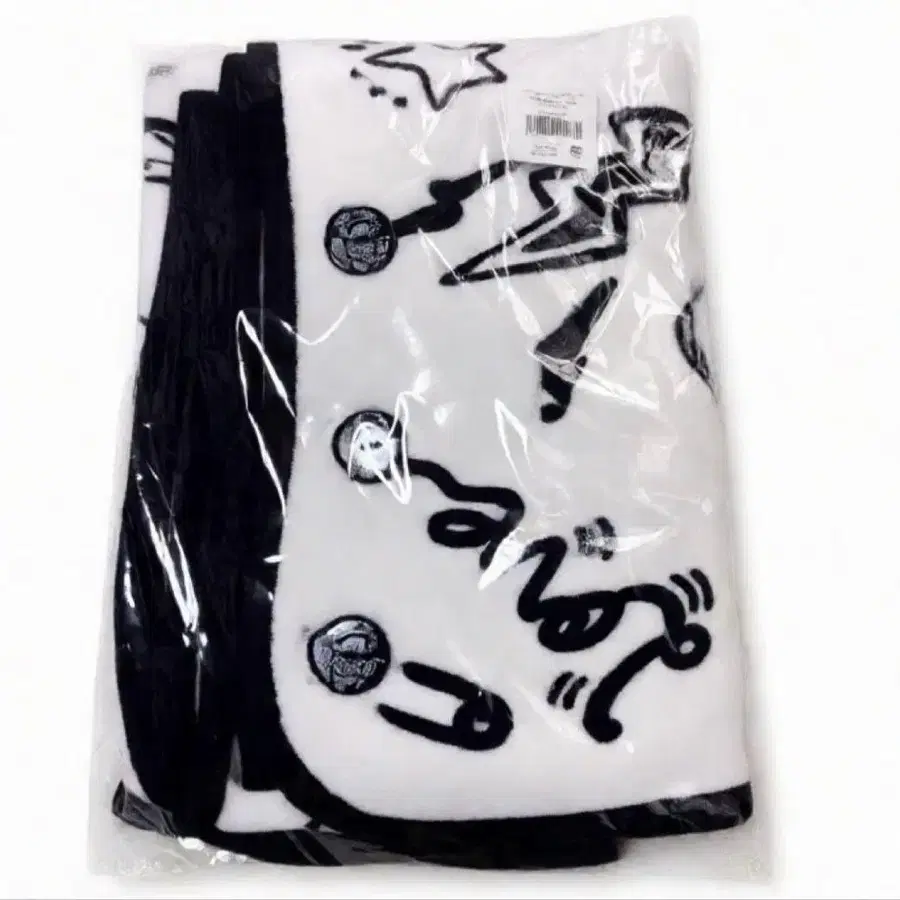 NAOTO 프로듀스의 플리스 담요, 화이트 베이스에 블랙 그래픽 디자인.