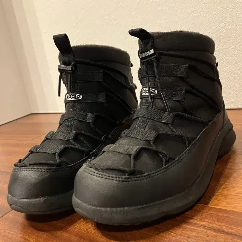 조정 가능한 스트랩이 달린 블랙 하이컷 부츠, 플리스 안감으로 쾌적함을 제공합니다.
