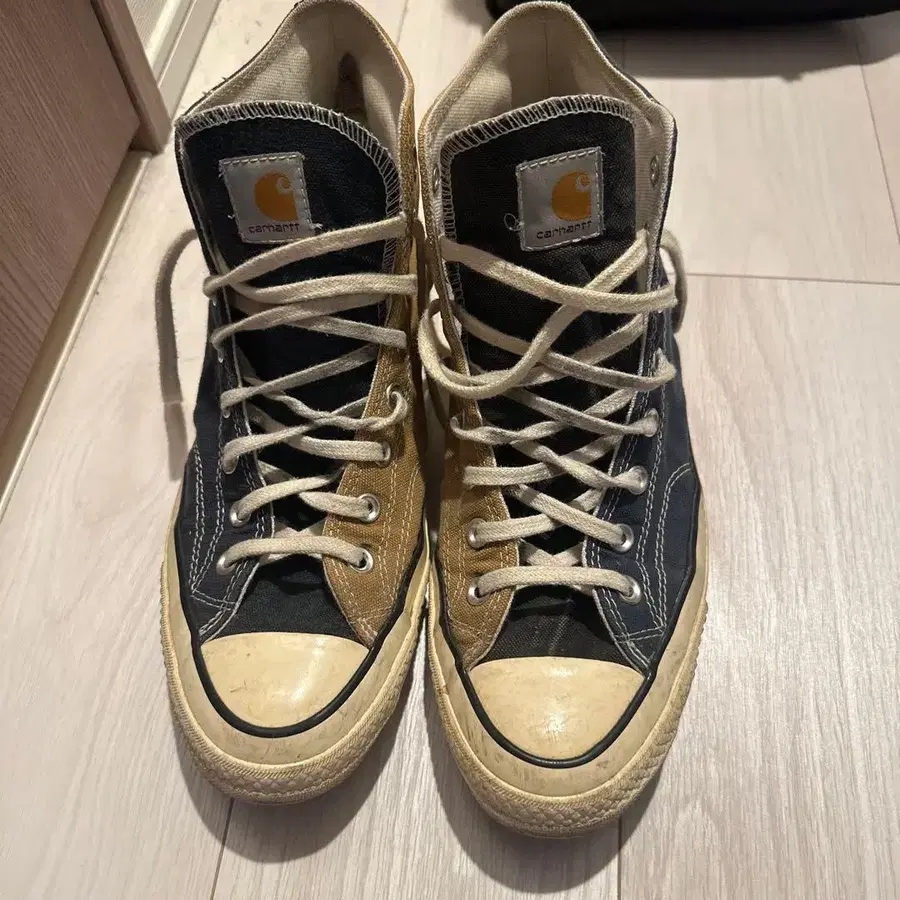 본 콜라보 모델은 Carhartt의 빈티지 워크 자켓, 팬츠, 오버롤을 해체하여 그 원단을 채용한 신발을 제작했습니다.