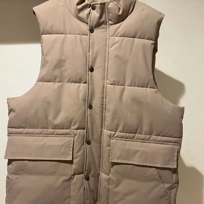 gerry 브랜드의 심플한 디자인 베이지 다운 베스트입니다. 단추식이며 포켓이 있습니다.