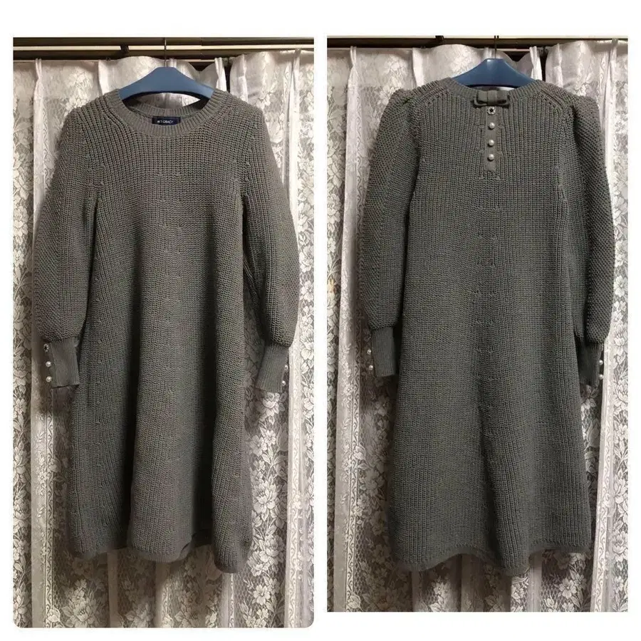 택 포함 새상품 엠즈 그레이시 니트 원피스 소매, 뒷면에 비쥬 버튼과 펄이 달려 있어 귀엽습니다. 컬러 그레이 사이즈 40 총장 약 93cm 어깨 너비 약 31cm 가슴 너비 약 54cm 소재 폴리에스테르 100%