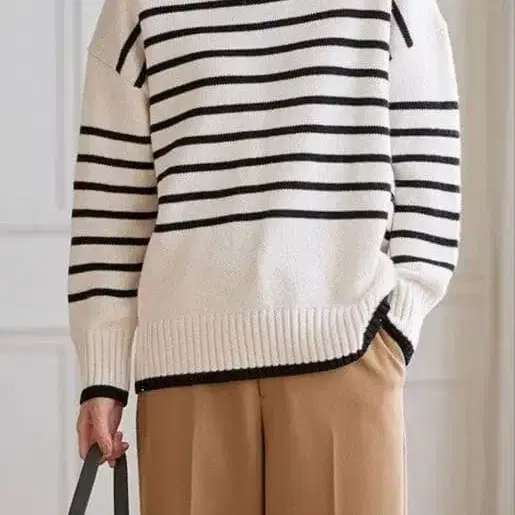 미사용 새상품 심플한 천축 편직의 하이넥 디자인으로 몸통 부분은 허리 둘레가 깔끔하게 보이는 디자인입니다. 길이는 앞뒤에 차이를 두어 체형 커버도 가능한 니트입니다. 어떤 하의와도 잘 어울리는 길이감입니다. - 색상: 보더 - 디자인: 하이넥 - 소매 길이: 긴팔 - 소재: 울 혼방 - 핏감: 루즈핏 사이즈: 프리 사이즈
