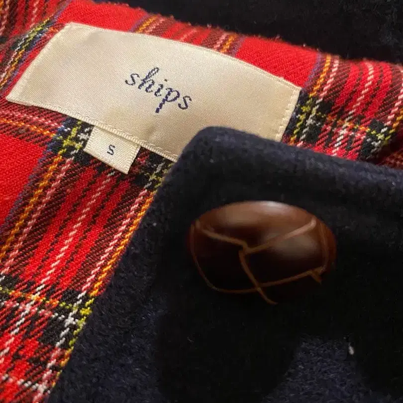 네이비 색상의 후드 부착 더플 코트, 체크 무늬 안감이 특징.