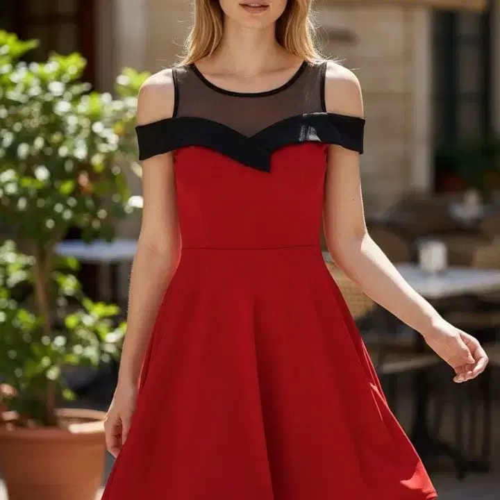 오프숄더 빨간색 드레스, 스트레치 소재로 뛰어난 핏감.