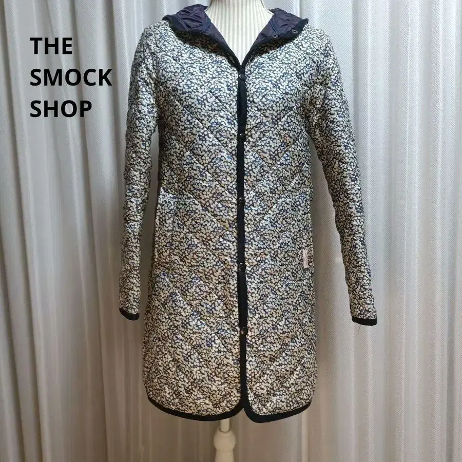 화이트, 네이비, 스카이블루, 핑크의 작은 꽃무늬로 걸치면 얼굴 주변이 밝은 인상을 주는 퀼팅 코트입니다.