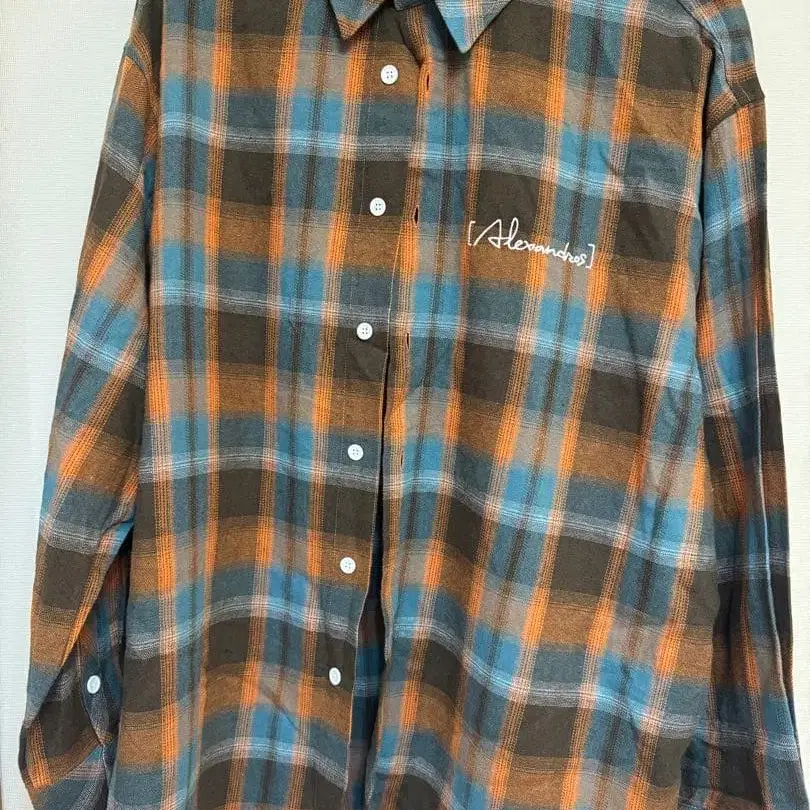 브라운, 블루, 오렌지 체크 무늬의 L 사이즈 플란넬 셔츠. 자수 디자인.