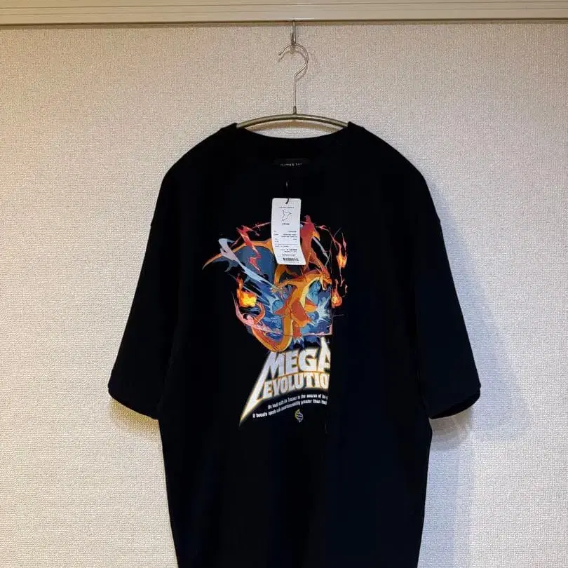 MEGA EVOLUTION 디자인의 블랙 T셔츠, 포켓몬 팬이라면 필견!