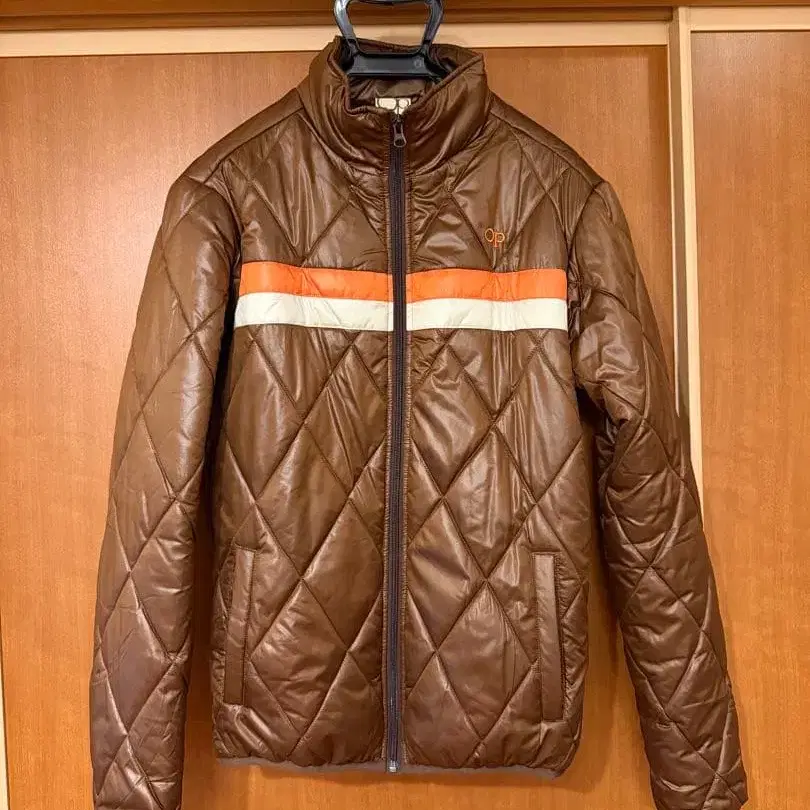 퀼팅 디자인의 브라운 다운 자켓, 오렌지와 화이트 스트라이프 포함. - 색상: 브라운 - 디자인: 퀼팅 - 브랜드: OP - 스트라이프: 오렌지와 화이트 스트라이프 방문해 주셔서 감사합니다.