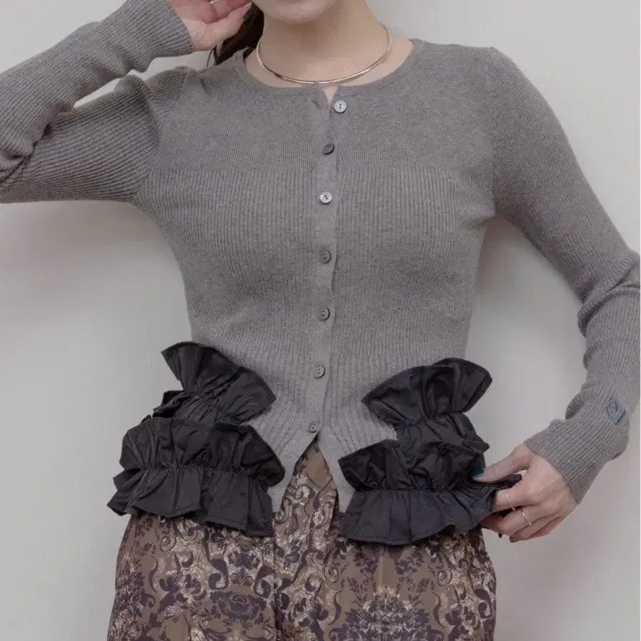 Eimee raw 개더 프릴 헴 리브 니트 가디건