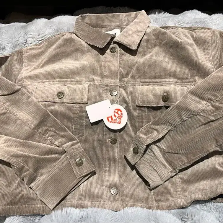 베이지 색상의 코듀로이 캐주얼 자켓, 버튼이 달린 프론트 디자인.