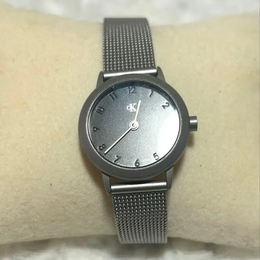 심플하고 세련된 디자인의 Calvin Klein 시계. 스테인리스 스틸 메쉬 밴드가 특징입니다.