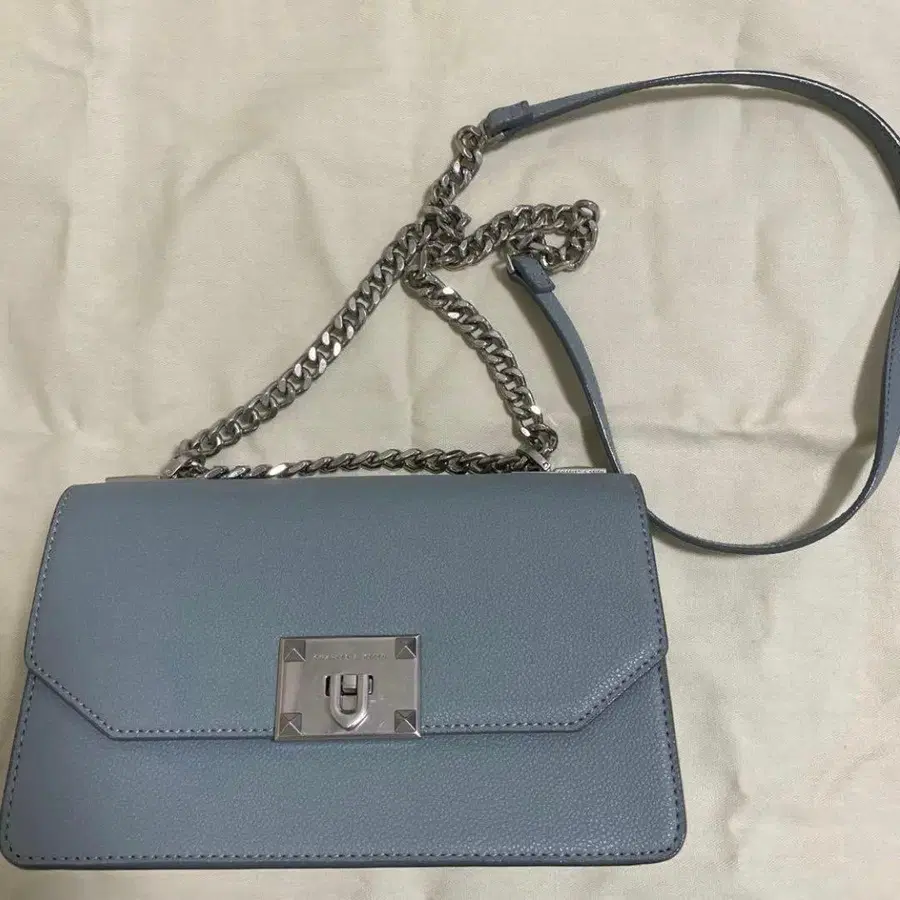 자동 번역되었어요. 원문보기라이트 블루 색상의 플랩 숄더백으로, 금속 클로징과 조정 가능한 체인 스트랩이 특징입니다.