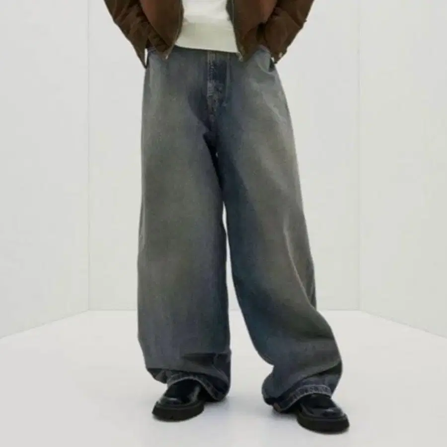 그레이 와이드 레그 데님 팬츠 페인트 가공