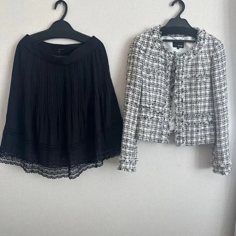 세레모니에 사용할 수 있는 고급 트위드 자켓과 플리츠 스커트 세트