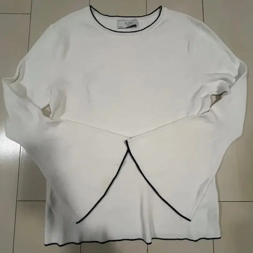 화이트 니트 스웨터, 블랙 테두리가 특징적이며 스타일리시한 디자인입니다.