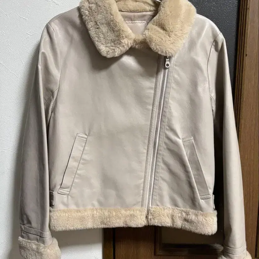 자동 번역되었어요. 원문보기베이지 색상의 가죽과 퍼를 사용한 숏 기장의 무스탕 코트.