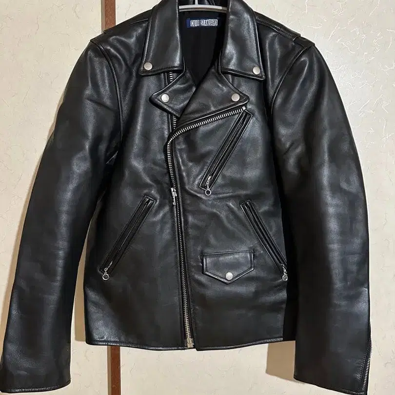 블랙 더블 라이더 자켓, 가죽 소재로 스타일리시한 디자인.