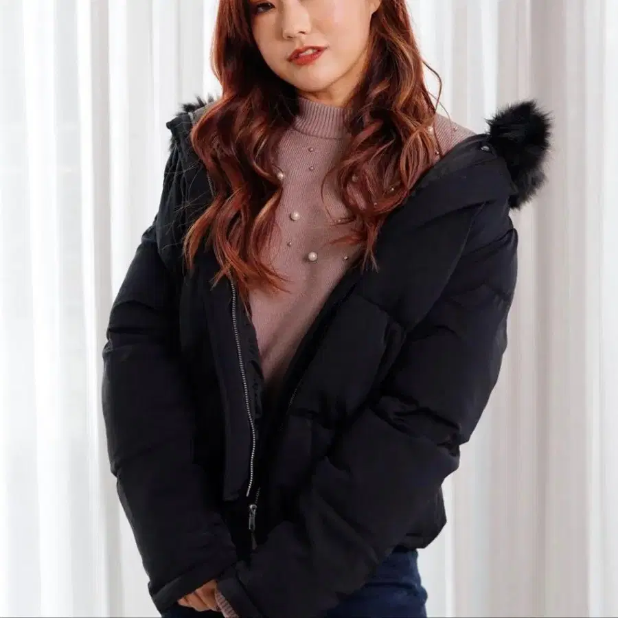 블랙 인조 모피 부착 다운 자켓