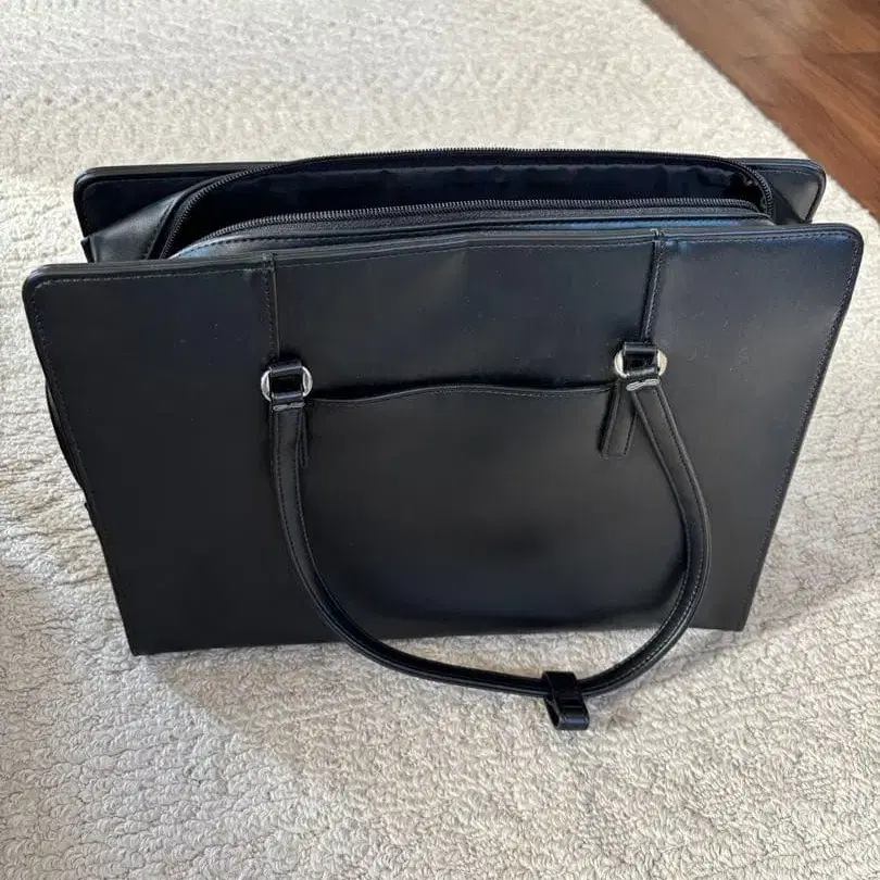 심플하고 세련된 블랙 비즈니스 백, 여러 개의 포켓과 더블 지퍼 포함.