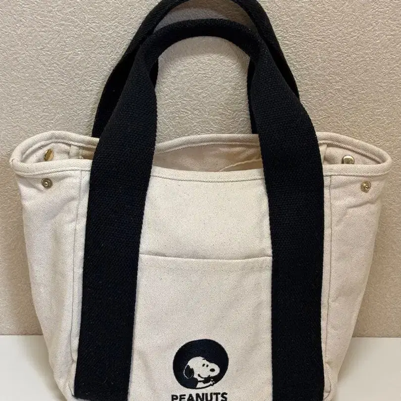 PEANUTS의 아이보리와 블랙 토트백, 11개의 포켓으로 수납력이 뛰어납니다. 마그넷 버튼이 있어 보이고 싶지 않은 짐도 수납하기 쉽습니다. 짐이 적을 때는 스냅 버튼을 닫아 컴팩트한 실루엣을 연출할 수 있습니다. 미사용품입니다. - 브랜드: PEANUTS - 포켓: 11개 포켓 - 디자인: 토트백 방문해 주셔서 감사합니다.