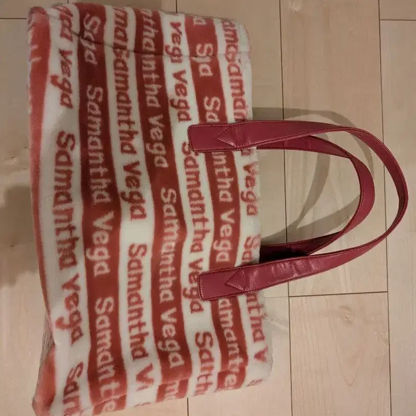 Samantha Vega의 플리스 소재 화이트와 핑크 토트백입니다. 사이즈는 가로 약 50cm, 세로 약 28cm, 폭 10cm입니다. 안쪽에 포켓 2개가 있습니다. 2~3회만 사용했기 때문에 눈에 띄는 얼룩 등은 없지만, 장기 자택 보관품이므로 노후화 등은 양해 부탁드립니다.