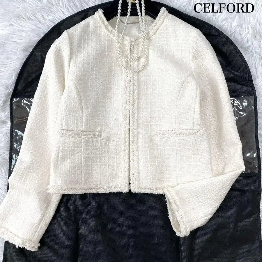 CELFORD 트위드 페플럼 자켓 노카라 포멀 36 사이즈