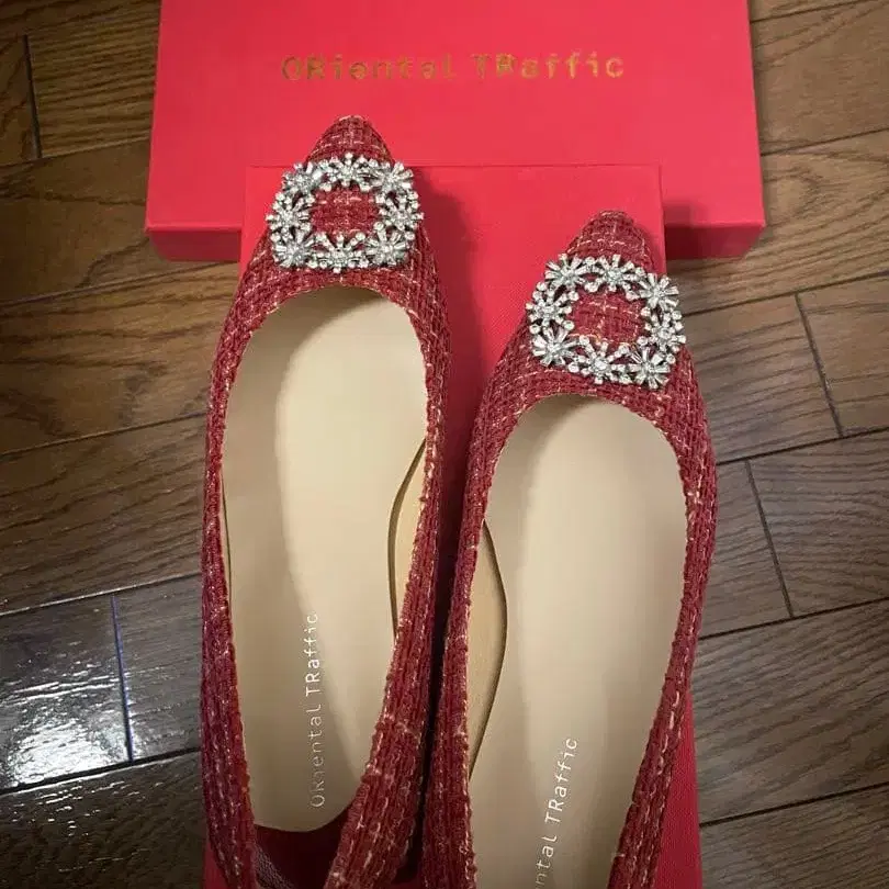 비쥬 장식이 있는 레드 트위드 플랫슈즈.