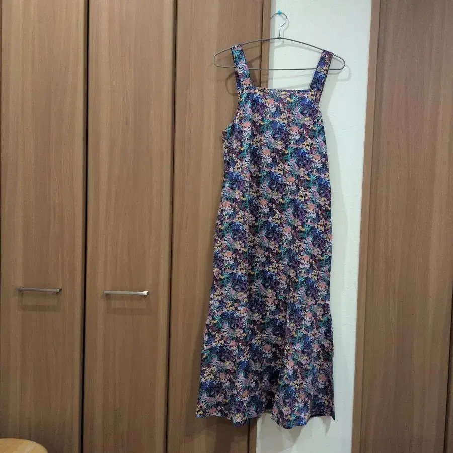 LIBERTY 브랜드의 네이비 꽃무늬 오버롤 스커트입니다. 코튼 100%로 편안한 착용감을 자랑합니다.