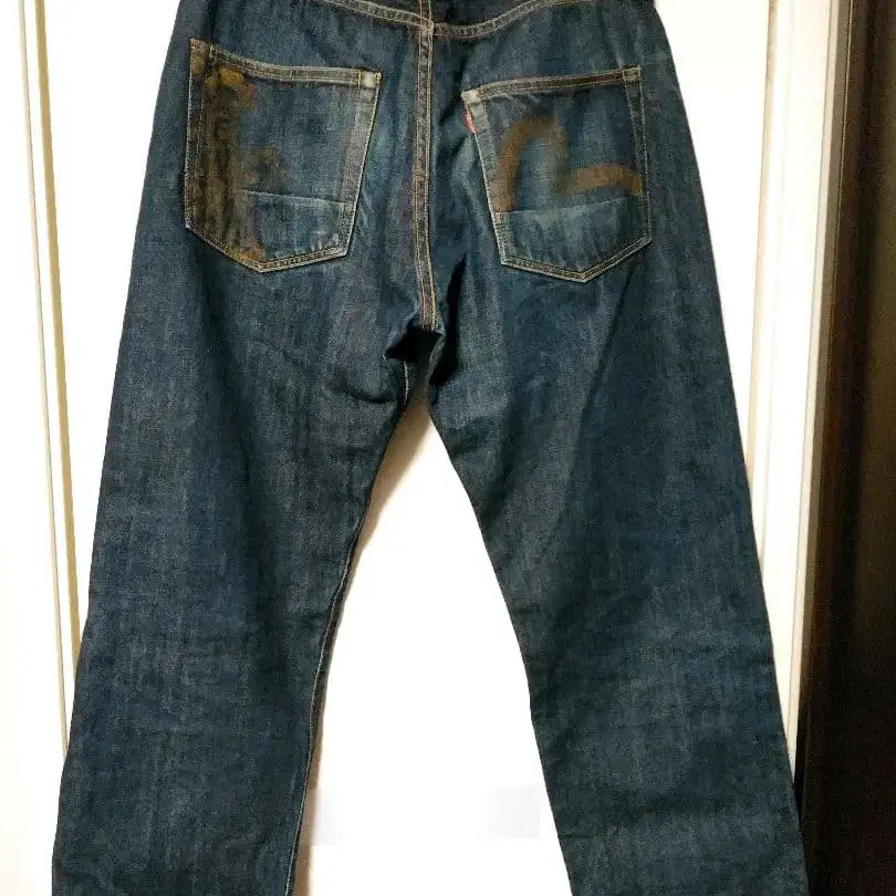 에비수 다크 블루 스트레이트 데님입니다. 특징적인 백 포켓 디자인이 매력적입니다.