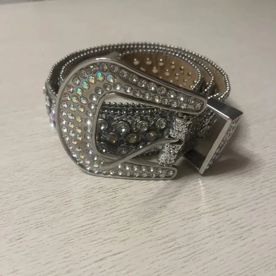 스톤 장식이 화려한 실버 컬러의 벨트. - 디자인: 스톤 장식이 있는 실버 컬러 벨트 - 소재: 가죽과 메탈의 콤비네이션 - 버클: 큰 스톤 버클 방문해 주셔서 감사합니다. 컬러 - 실버 계열 얼룩, 찢김, 냄새 등 - 없음 PCTokyo에서 구매했습니다.
