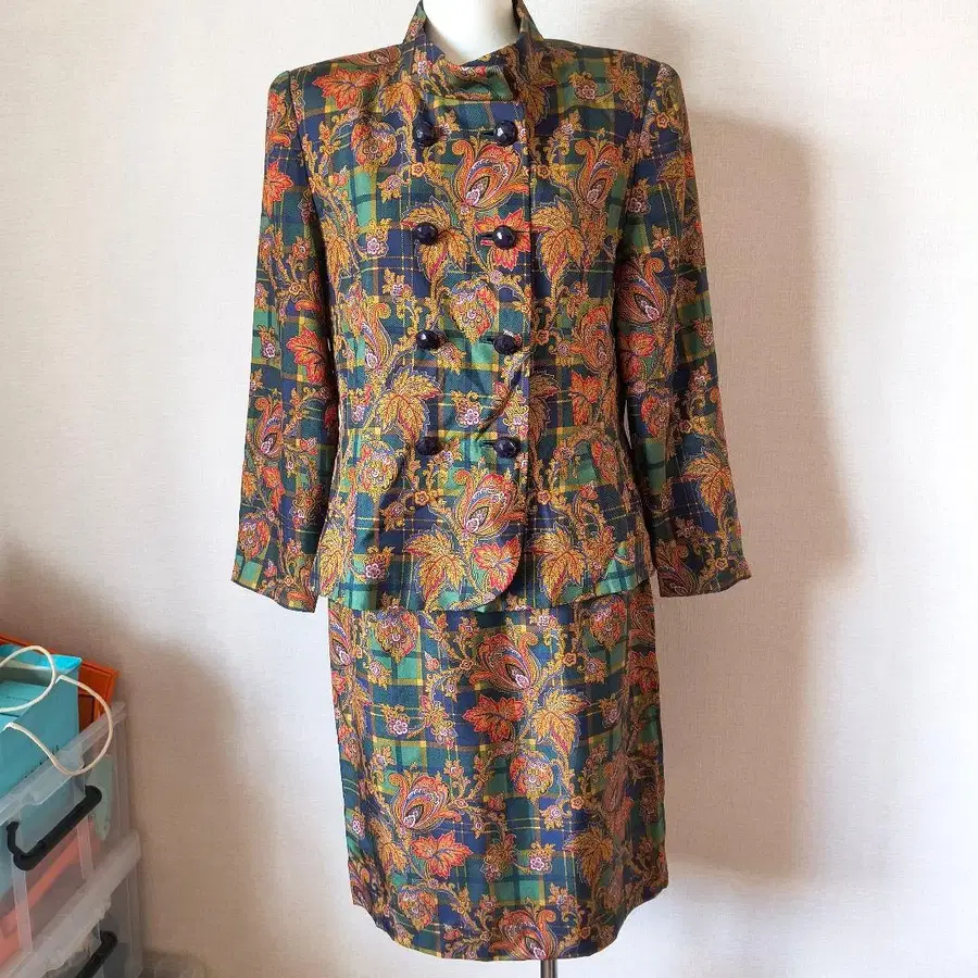 자동 번역되었어요. 원문보기꽃무늬와 체크 무늬의 아름다운 셋업, 장식적인 버튼 포함.