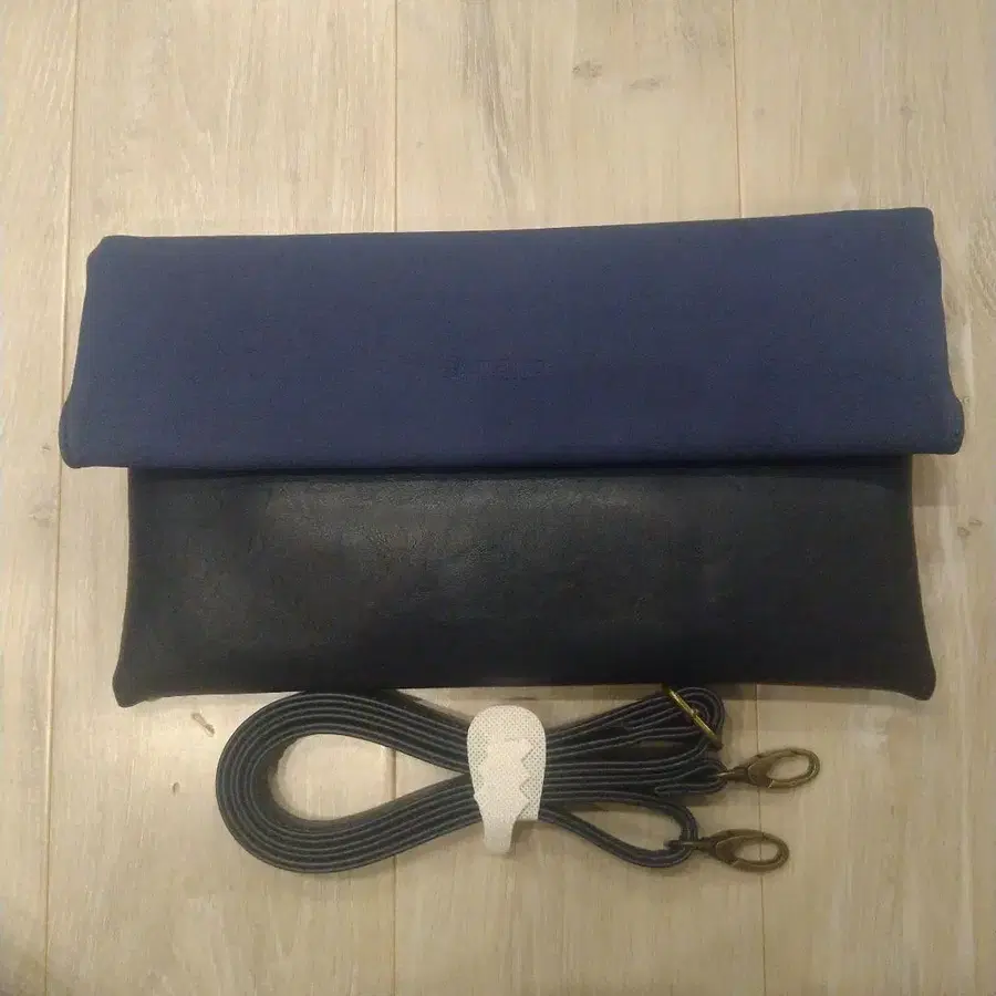네이비와 블랙 색상의 인조 가죽 클러치백이며, 탈부착 가능한 스트랩이 있습니다.
