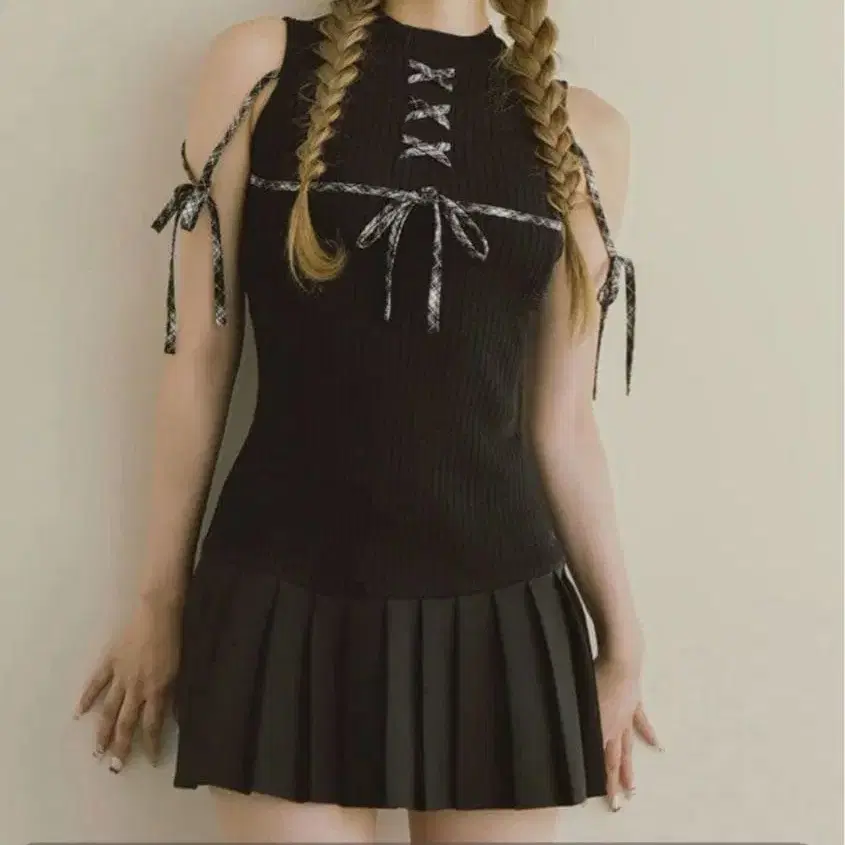 pium 피움 프론트 리본 초커 티어드 미니 원피스
