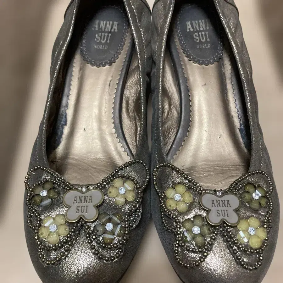 꽃 모티브와 비쥬 장식이 돋보이는 그레이 플랫슈즈. - 브랜드: ANNA SUI - 디자인: 플랫슈즈 - 장식: 꽃 모티브와 비쥬 - 색상: 그레이 - 스타일: 캐주얼 방문해 주셔서 감사합니다.