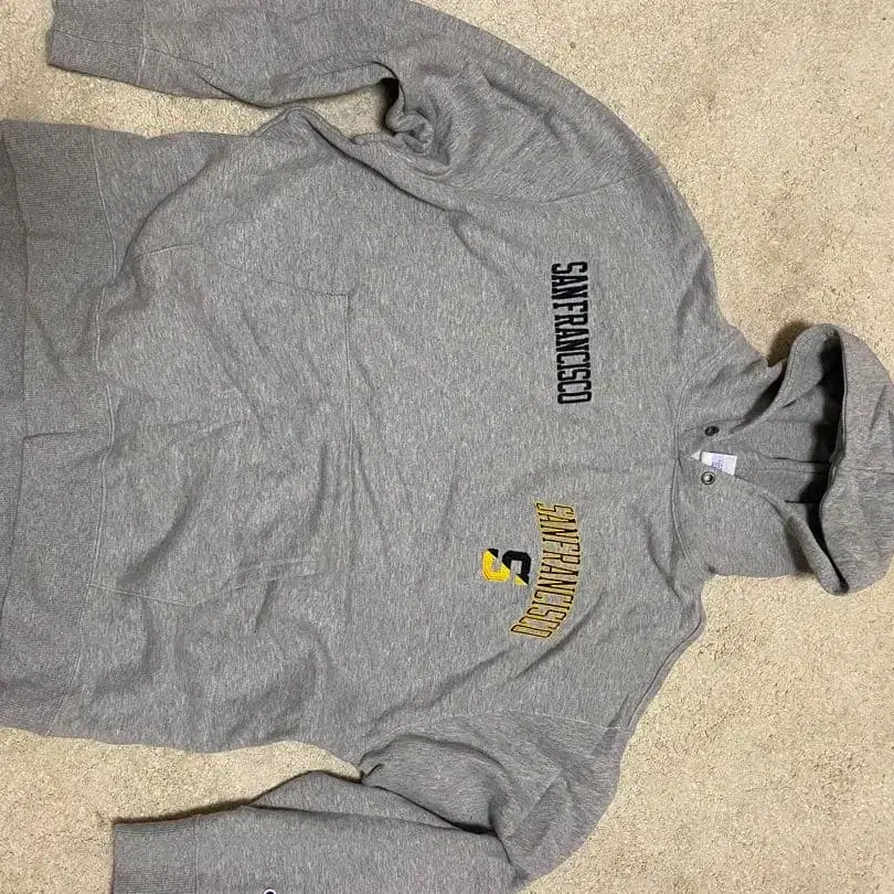 샌프란시스코 자수가 들어간 그레이 색상의 후드티. - 브랜드: Champion - 사이즈: LARGE - 색상: 그레이 - 디자인: 샌프란시스코 자수 - 특징: 후드 부착 방문해 주셔서 감사합니다. 새상품으로 구매했으며, 흠집이나 얼룩은 없지만, 어느 정도 착용한 제품이므로 이해해 주시기 바랍니다. L 사이즈이지만, 신장 180cm에게 빅 사이즈입니다.
