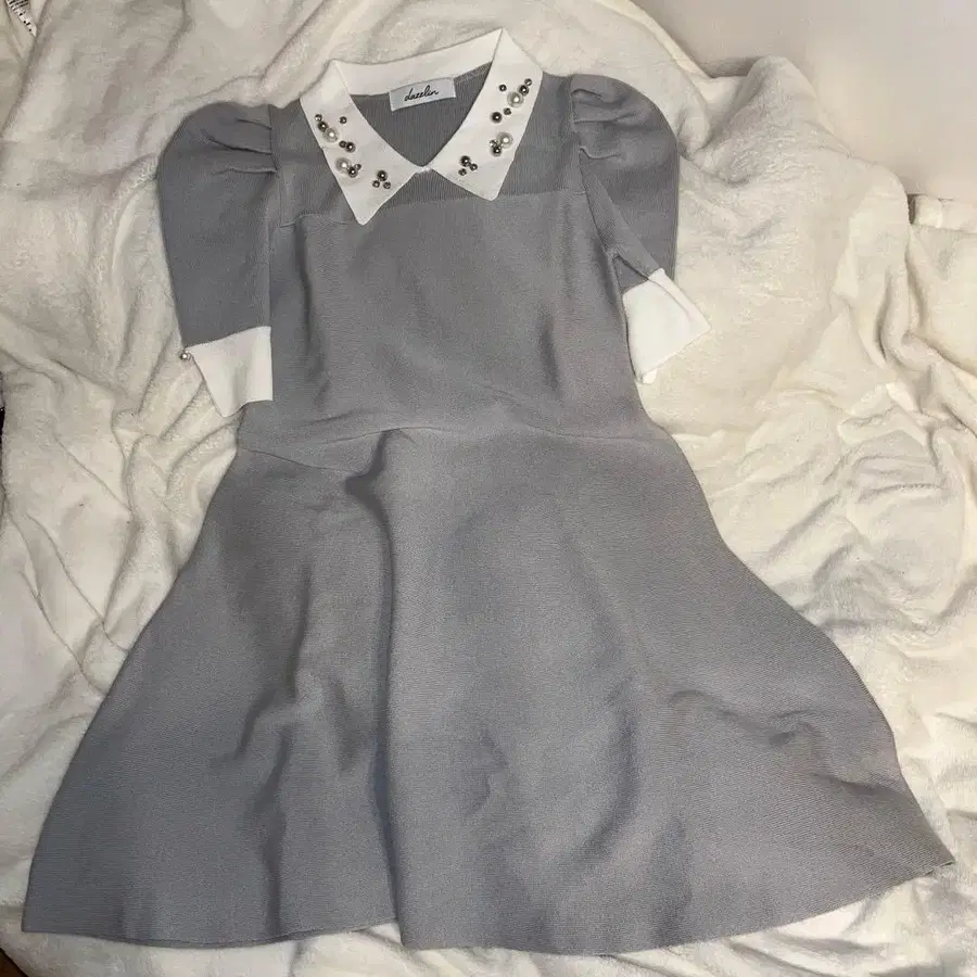 자동 번역되었어요. 원문보기퍼프 슬리브와 오너먼트 같은 펄과 비쥬가 뿌려진 장식적인 흰색 옷깃이 특징인 그레이 미니 원피스.