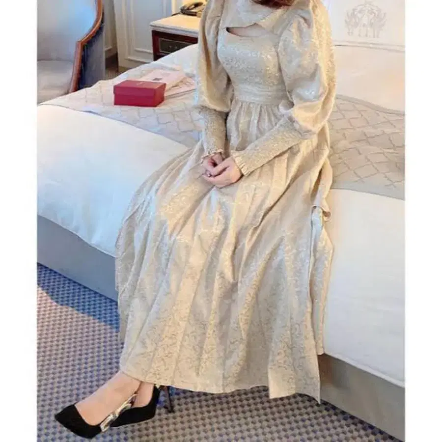 엘레강트한 골드 긴팔 드레스, 레이스 무늬가 특징. - 색상: 골드 - 소매 길이: 긴팔 - 디자인: 레이스 무늬 - 스타일: 엘레강트 방문해 주셔서 감사합니다. 사이즈 - FREE SIZE