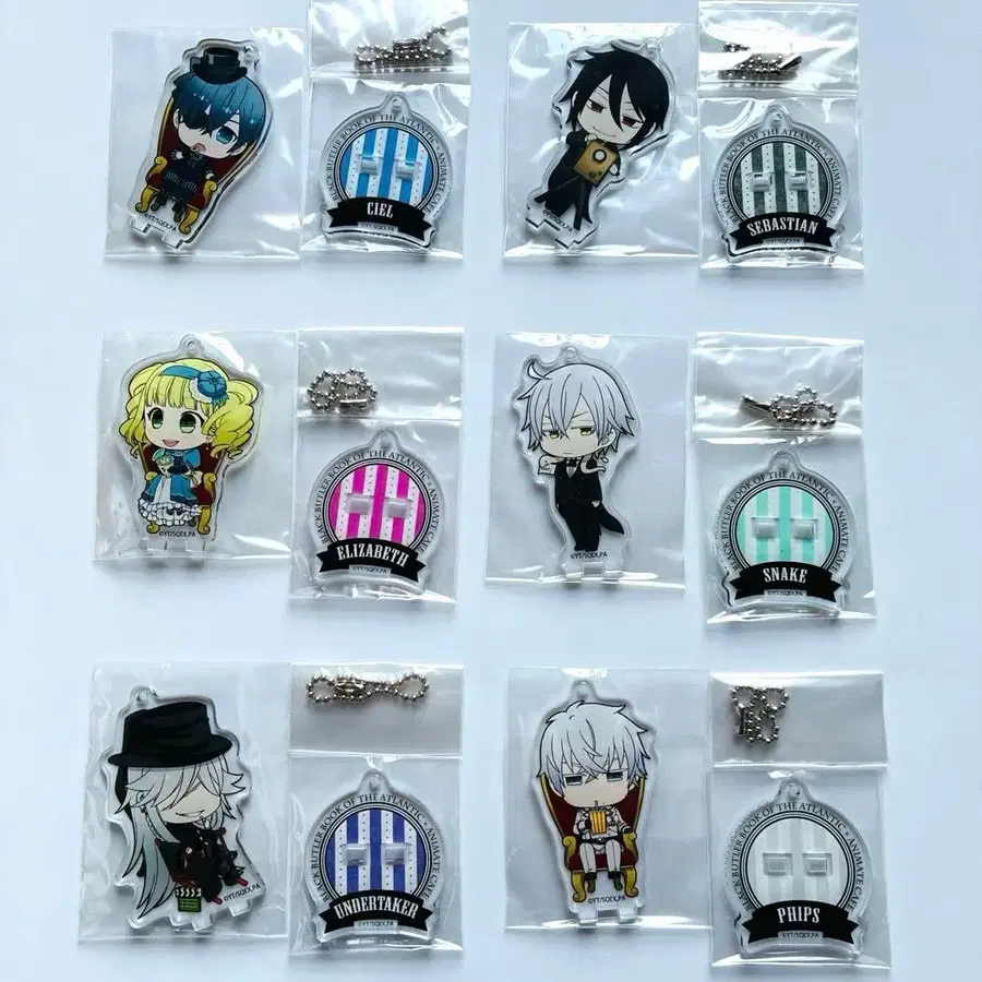 극장판 흑집사 Book of the Atlantic 아크릴 스탠드 키링 6종 (시엘, 세바스찬, 스네이크, 엘리자베스, 장의사, 찰스 필립스) 낱개 판매는 받지 않으니 양해 부탁드립니다. 어두운 곳에 보관했습니다. 미개봉이지만, 연도가 지난 중고품이라는 점을 이해해 주시길 부탁드립니다. 흑집사 상품을 다른 것도 판매 중이니, 괜찮으시면 봐주세요.