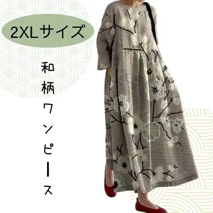 매실 패턴 재패니즈 모던 롱 원피스 체형 커버 그레이 2XL 사이즈