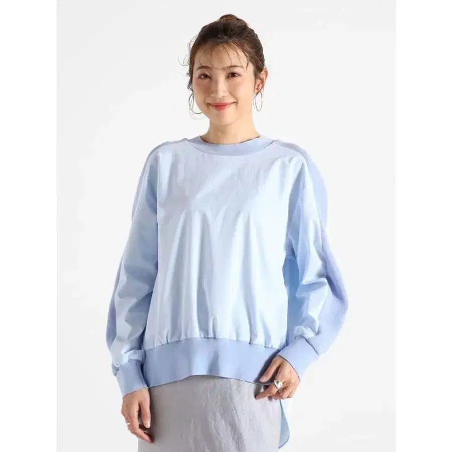 이종 소재를 믹스한 디자인이 매력적인 상의.