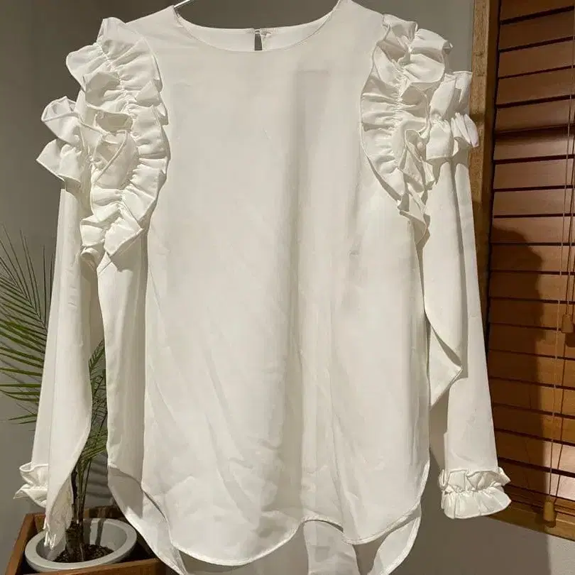 프릴 디자인의 화이트 긴팔 블라우스, 폴리에스테르 100%로 가벼움.