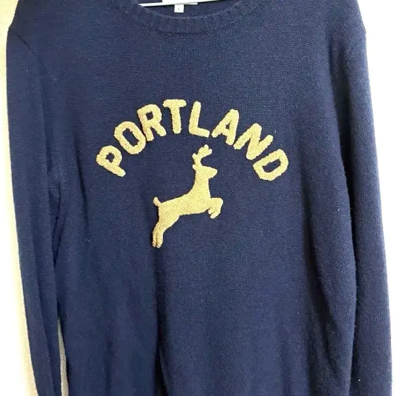 네이비 색상의 BEAMS 니트 스웨터, PORTLAND과 사슴 자수. 사이즈: L 가슴 너비: 52 어깨 너비: 41 기장: 66 팔 길이: 68