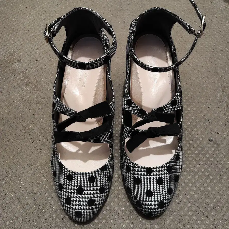 체크 무늬와 물방울 패턴 디자인이 특징인 앵클 스트랩 힐.